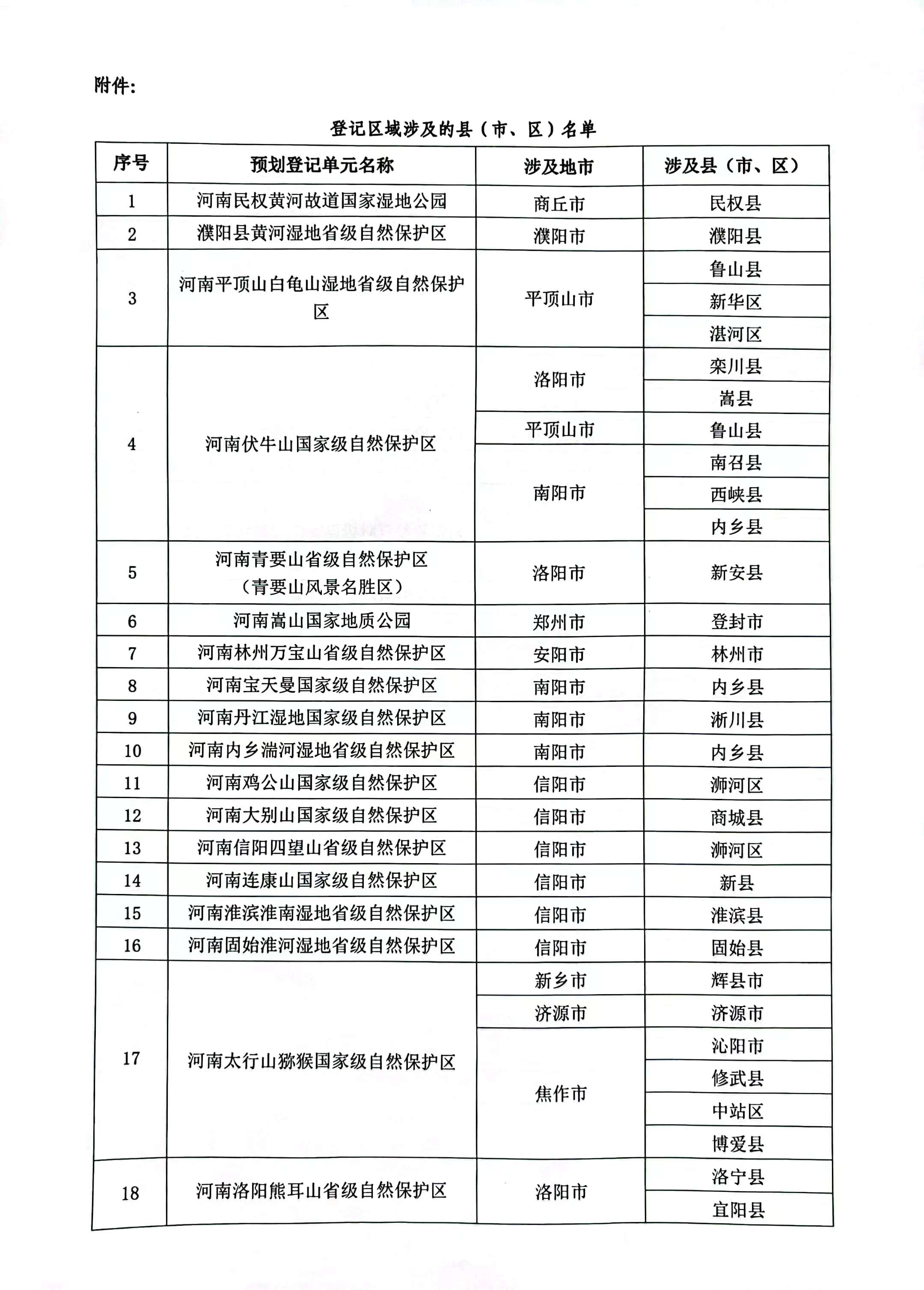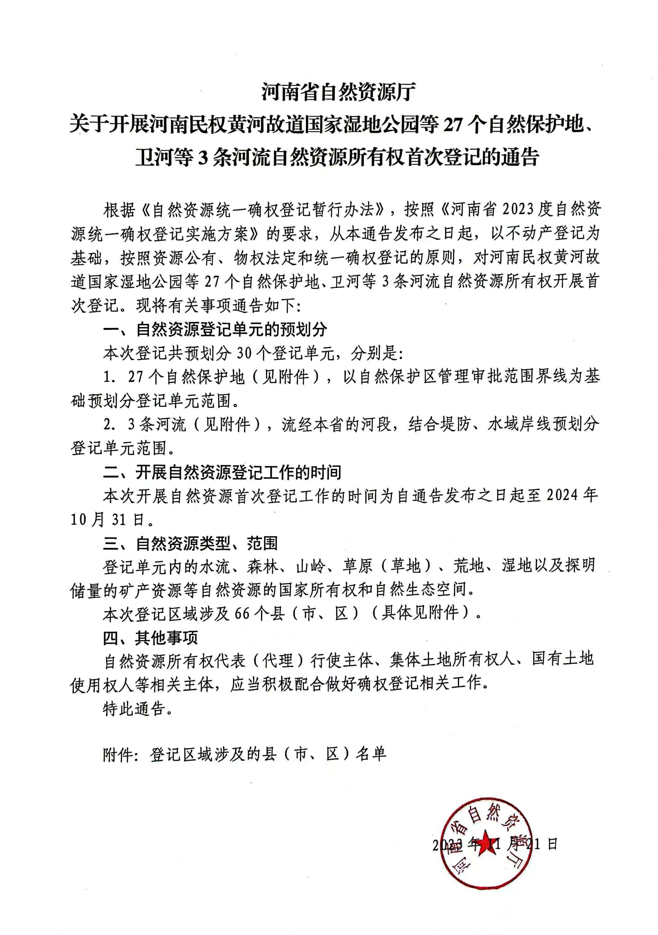 河南省自然资源厅关于开展河南民权黄河故道国家湿地公园等27个自然保护地、卫河等3条河流自然资源所有权首次登记的通告